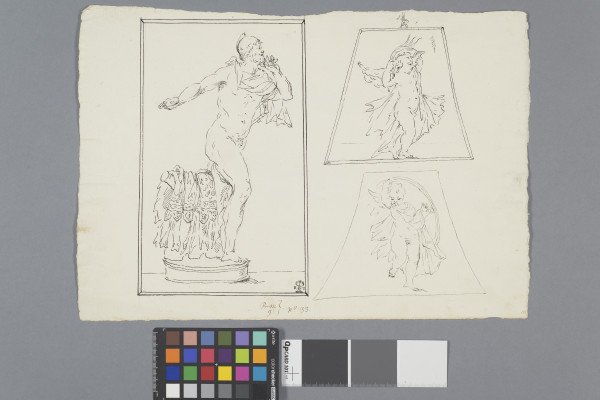 b) One of the panels from the triangular base in Bm 9. 31. It shows a winged putto, his cloak spreading behind him, holding an object, perhaps a helmet, over his head as he moves right.