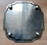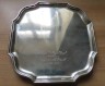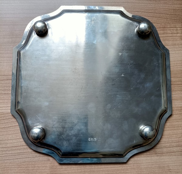 Salver, with shaped corners, moulded edge and engraved lettering; four bun feet