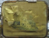 Mahogany and rosewood pole screen; the rectangular petit point needlework panel embroidered with a pastoral scene within a moulded frame, on a turned stem and tripod base with pad feet