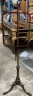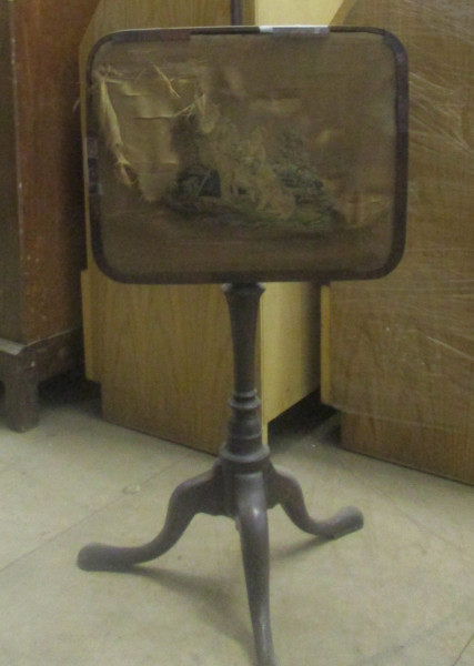 Victorian mahogany and rosewood pole screen, the rectangular petit point needlework panel embroidered with a pastoral scene, tripod base with pad feet