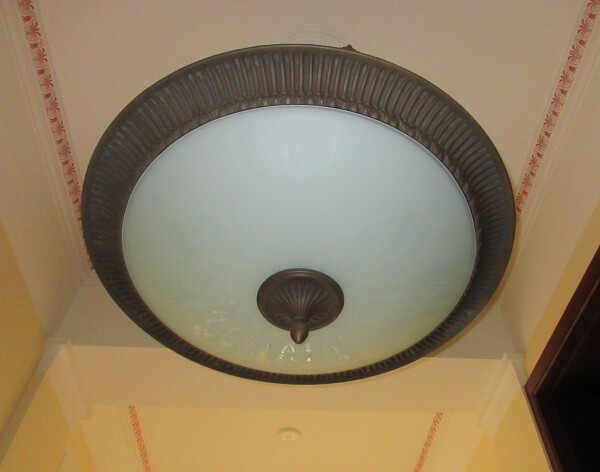 Set of four patinated bronze and engraved frosted glass hanging lights, of dished form