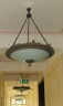Set of four patinated bronze and engraved frosted glass hanging lights; of dished form, with a fluted reservoir, the frosted glass shade with stylised Greek key and foliage, surmounted by stylised anthemions and scrolls suspended by three knopped chains