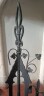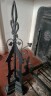 Cast and wrought iron fire dog; in Neo-Gothic-style, the cresting with a pierced lily above scrolls of ivy leaves with three tracery arches, spiral-twist stem, on a triform stepped base, the support cast with a further pierced lily