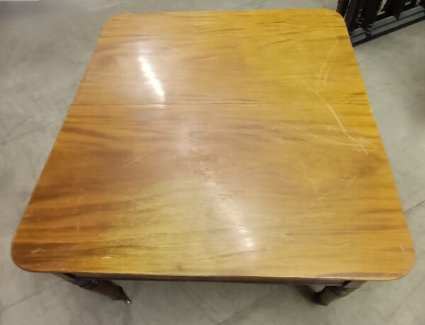 Mahogany extending dining table; with a rectangular divided top, above a plain frieze, on globular and ring turned tapering legs, with brass caps and castors; restorations