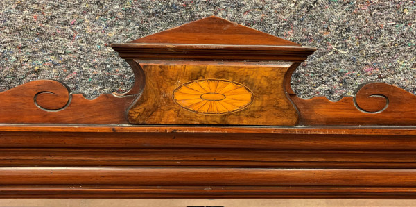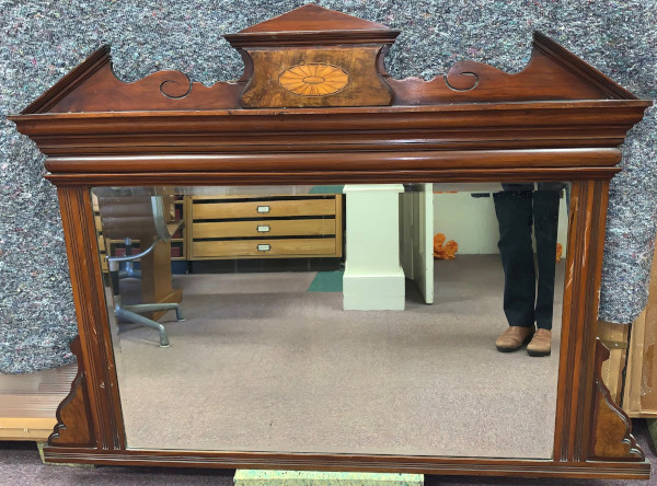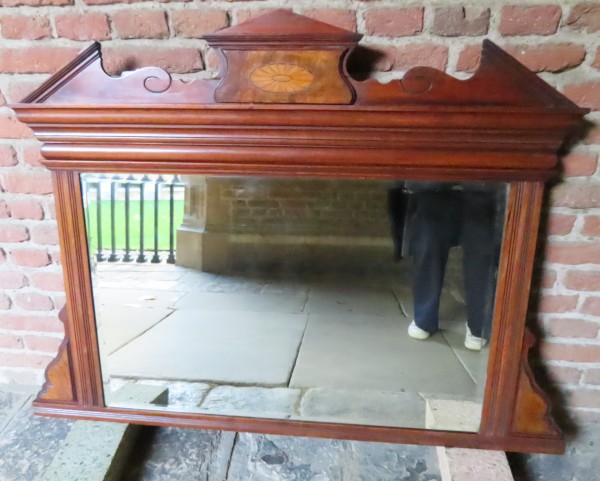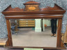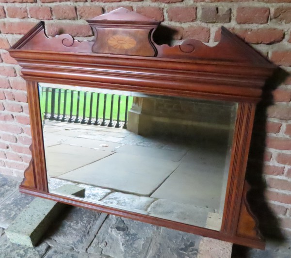 Edwardian burr walnut veneered and satinwood inlaid mahogany overmantel mirror, of rectangular form, the cresting with a broken pediment centred by a flaring burr walnut veneered panel inlaid with a stylised satinwood patera, flanked by an incised scroll, above a tapering moulded cornice and rectangular bevelled plate, the reeded sides each with a scrolled corbel, on a platform base, the back panelled in pine