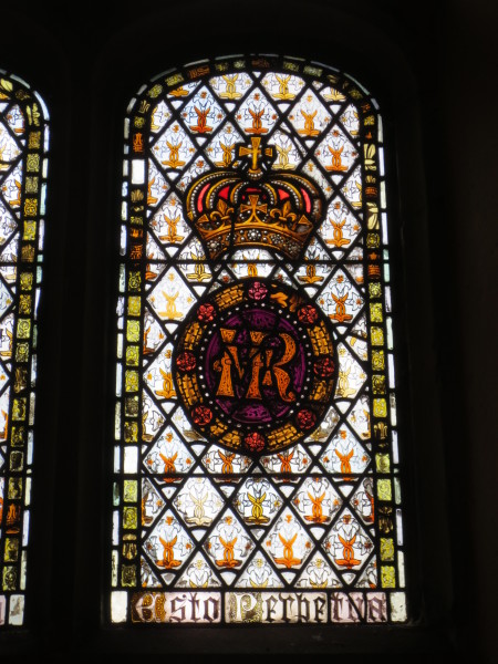Stained glass window; the design includes the monogram 'H VI R' with a crown above, surrounded by a repeating pattern of three lilies
