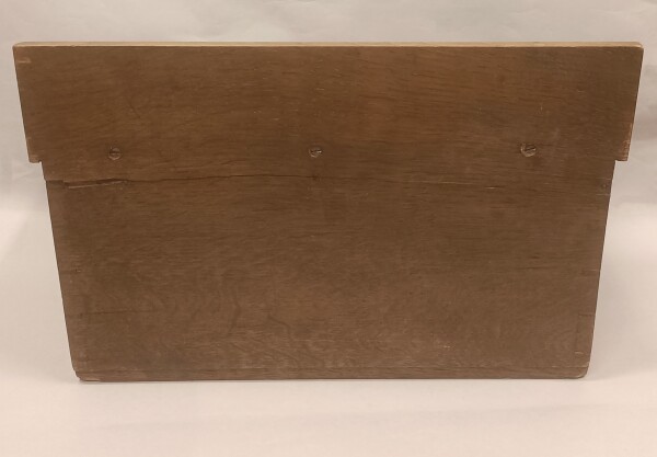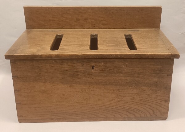 Three oak caskets/ boxes: comprising a pair of rectangular form with three slits in the hinged top with three internal compartments, the third later and with a single slit in the top