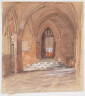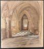 Davison came from a Worcestershire-based family and her early life was spent in the county. The Davisons were a family of clerics and Nora’s paternal grandfather, the Rev. John Davison (1777–1834), was a prebendary (senior clergyman) of the cathedral in Worcester, where he is buried. Davison was undoubtedly familiar with the impressive building, which dates back to the 11th century. Here she depicts the Norman cloisters, extensively rebuilt in the late 14th and early 15th centuries. The distinctive floor tiles, chosen by architect Abraham Edward Perkins (1808–1873), were first intended for the nave, but were deemed unsuitable and instead laid in the cloisters in 1873.
