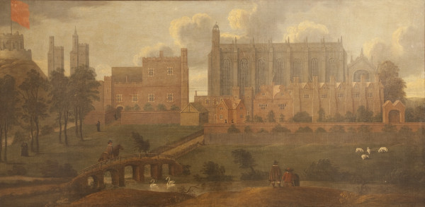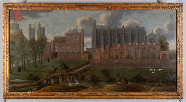 There is more to find out about this mysterious view of Eton College. The frame has a label, which bears the title 'Eton College Chapel, the Provost Lodgings and Windsor Castle about 1600'. However, the date of the work has long been contested and current thinking is that it was painted during the mid-17th century. Although attributed to an unknown painter, the work was formerly ascribed to Dutch émigré artist Jan Wyck (c.1645–1700).