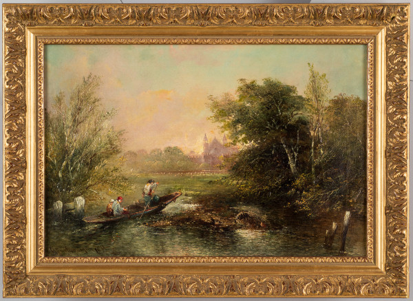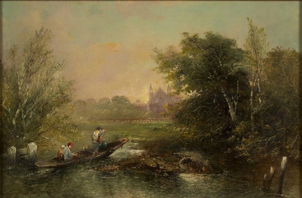 Signed and dated, and title inscribed in oil paint, on verso of canvas: 'Eton / Eton College from the backwater / Evening / by Clifford Montague'