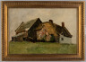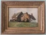 Painted landscape view of buildings, with grassy foreground and a pale sky