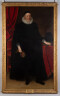 Portrait of a man, full-length, in a black doublet, hose, cloak and cap, holding gloves by a draped table, within a curtained interior